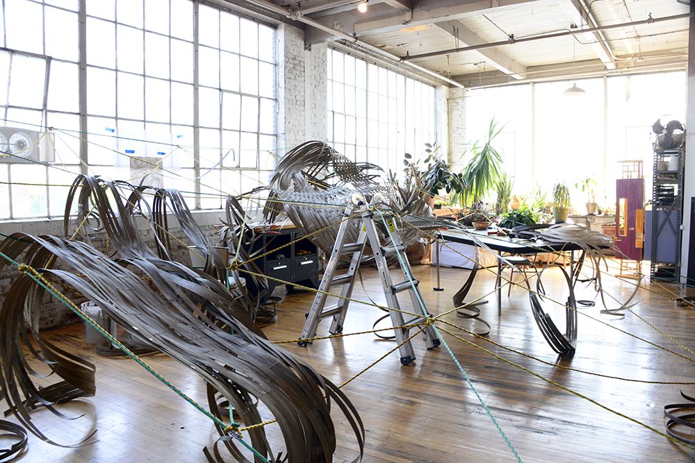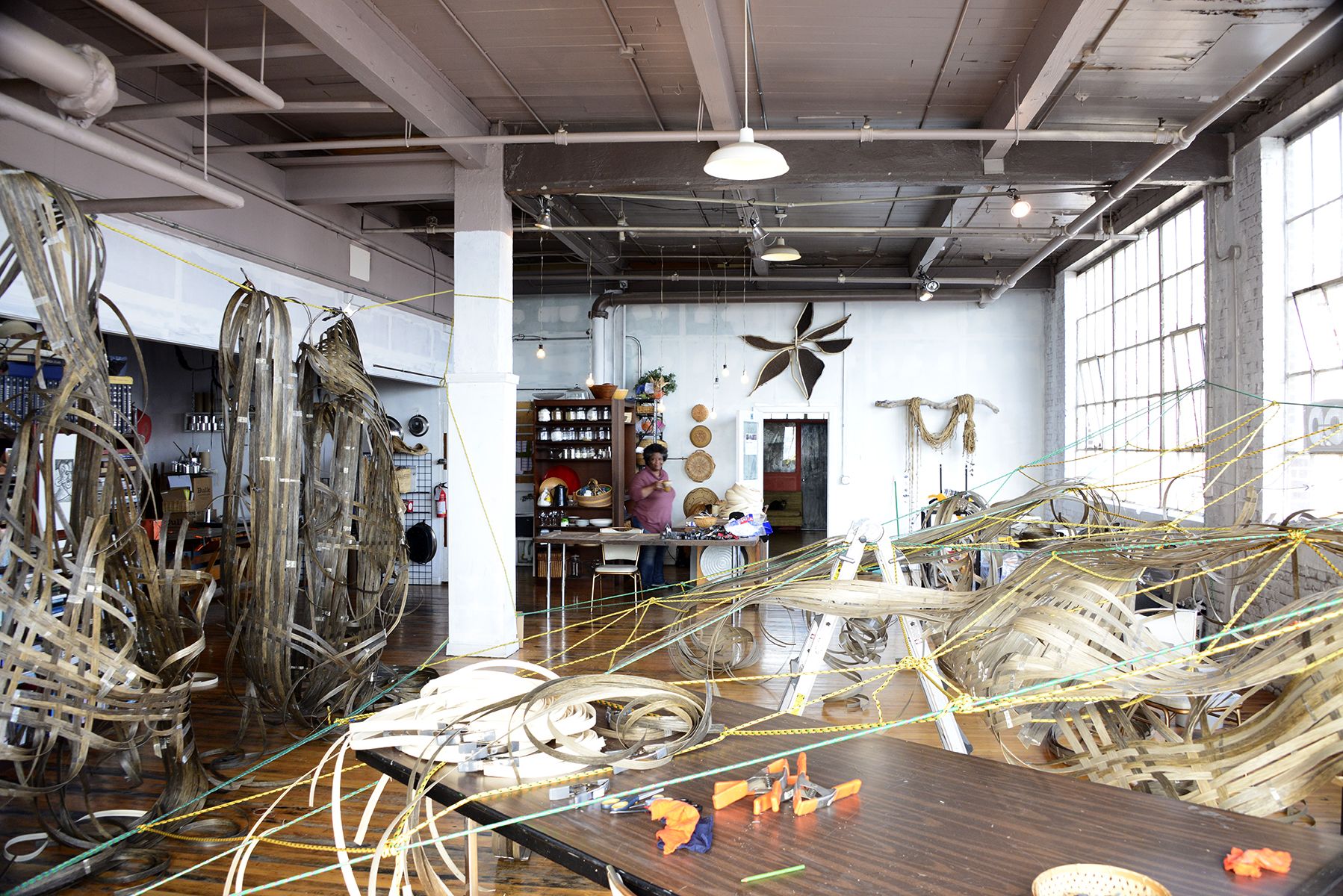 She creates in a studio among other area artists on the third floor of Cleveland’s 78th Street Studios. The space is large enough to display several of her sculptures, including a work-in-progress attached to the wall. On a recent morning, Spencer weaved together long pieces of dried, reed grass typically used in baskets, tying off sections with hemp thread.