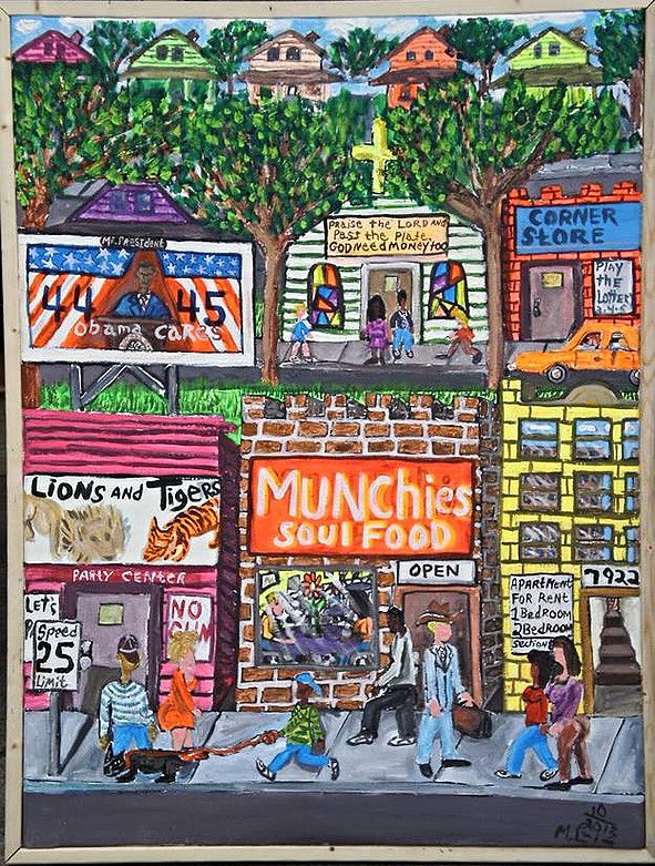By day, artist Michelangelo Lovelace heals others as a health care worker. At night, he nurtures his art. Painting for three or four hours a night, he pursues his lifelong passion and over the years developed a recognizable urban-folk art style reminiscent of “outsider” artists. While he doesn’t rely on his art to pay his bills, he recently sold out a gallery exhibition in New York.