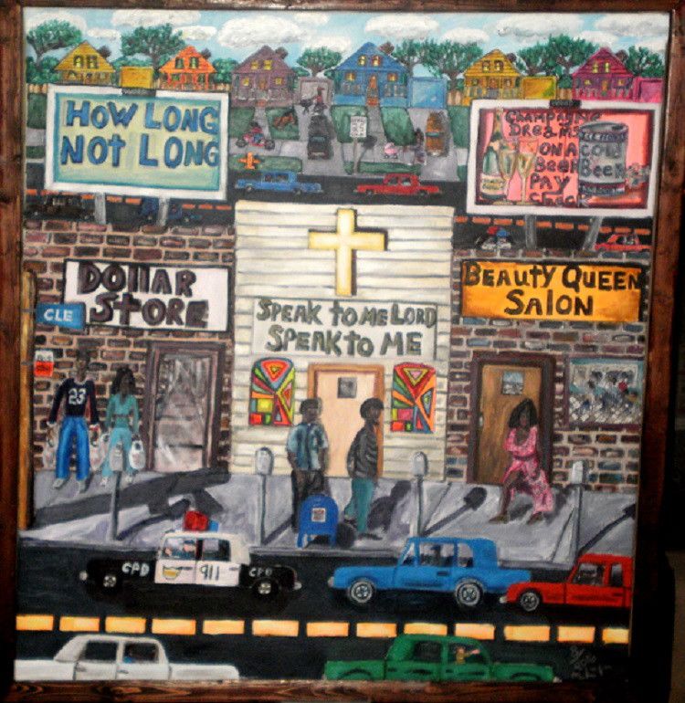 Born Michael Anthony, Lovelace goes by Michelangelo, a childhood nickname from his friends. He describes his paintings as a “documentation of urban life,” a snapshot of his experiences growing up in King Kennedy Estates, a subsidized housing complex in Cleveland’s Central neighborhood.
