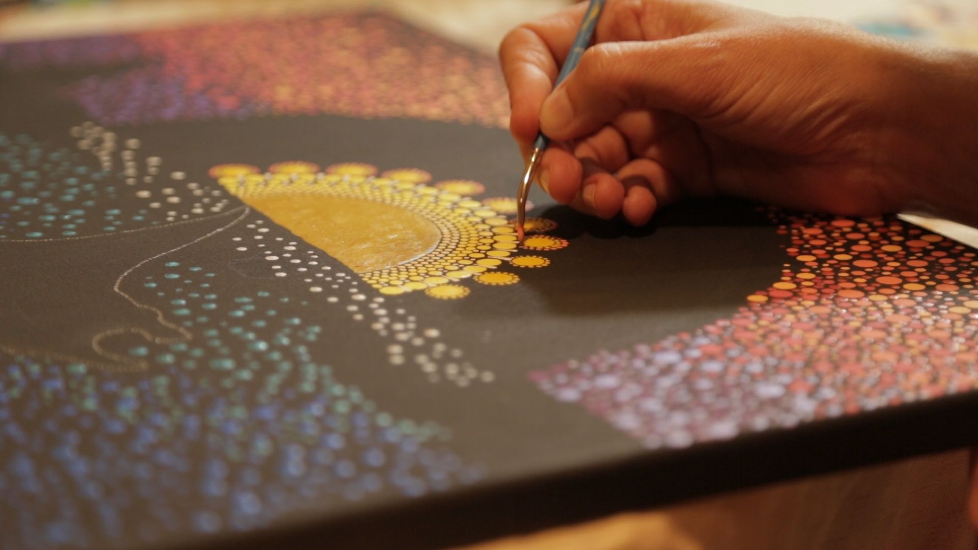 Pitrone’s designs vary from colorful mandalas painted on stones to dotted figures painted on canvases.