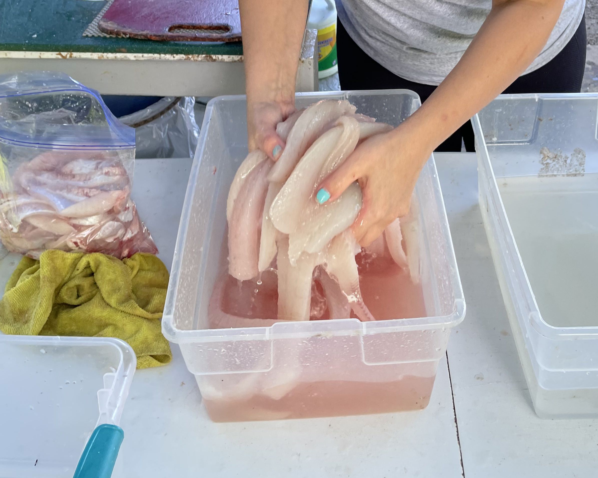 Devon Cutright slices bones off fresh caught walleye filets. [Jeff St. Clair / Ideastream Public Media]